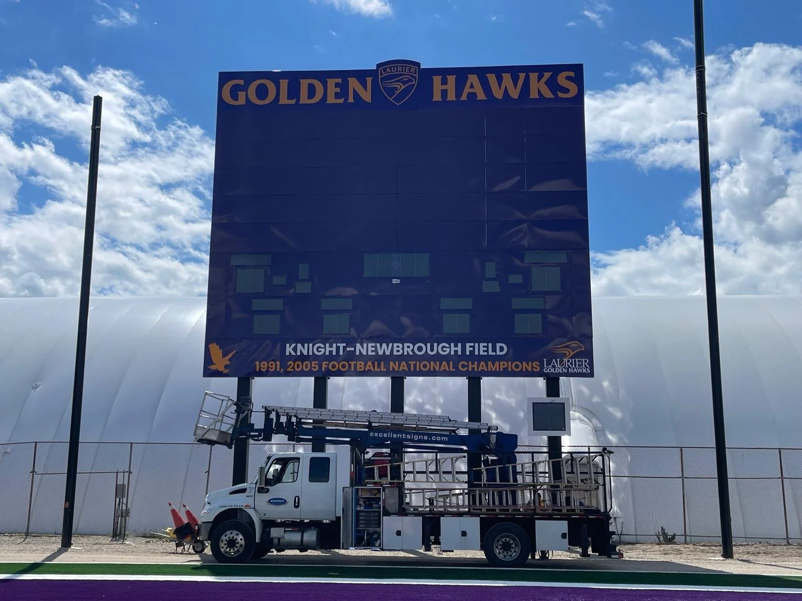 Collaborating with OES scoreboards, we have installed a stunning scoreboard measuring 50 feet in height and 40 feet in width at Seagram Field, located at Wilfrid Laurier University in Waterloo.